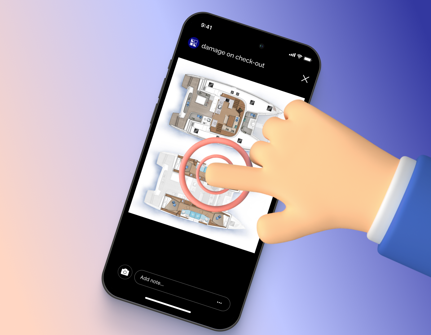 Damage gets reported on the spot — tap to mark the exact location on the boat's floorplan. Everyone sees it instantly.